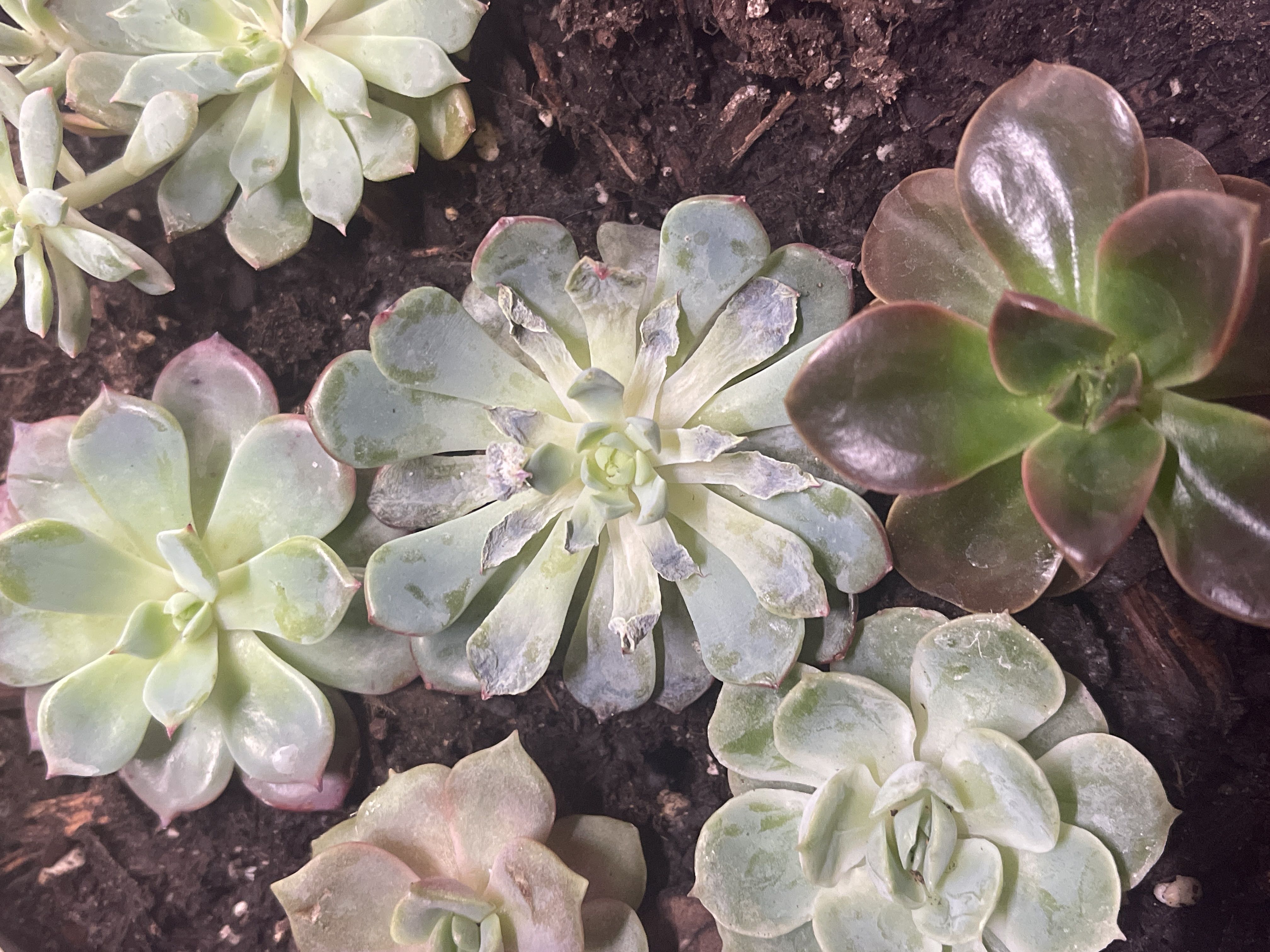 - Wilting and discoloration signal care issues in Echeveria minima.
