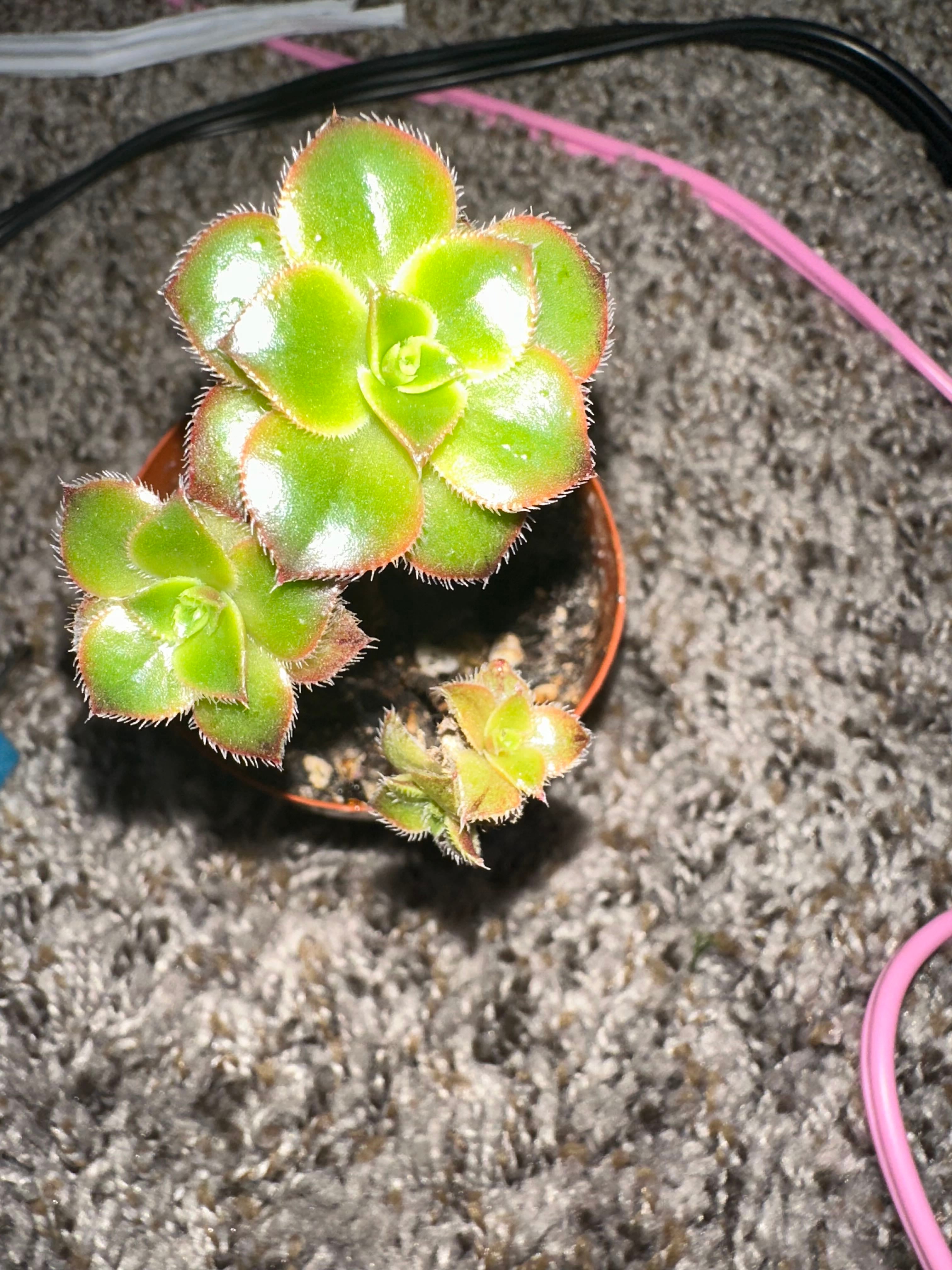 Get succulent soil from a home improvement store like Lowe’s or Home Depot, it helps it stay alive better. Make sure to have a pot with drain holes in the bottom, and not a miniature pot, around 4-6 inches should do. This plant craves sun light, and when it gets enough, it will turn towards the sun and turn a dark, rich red/purple color, so make sure to put this plant in a place with a lot of sunlight. It needs to be watered about every 6 days plus or minus but if you forget , no worries, it’s leaves will wrinkle but soon after you water it, the leaves will plump up again since this is a resilient plant.
