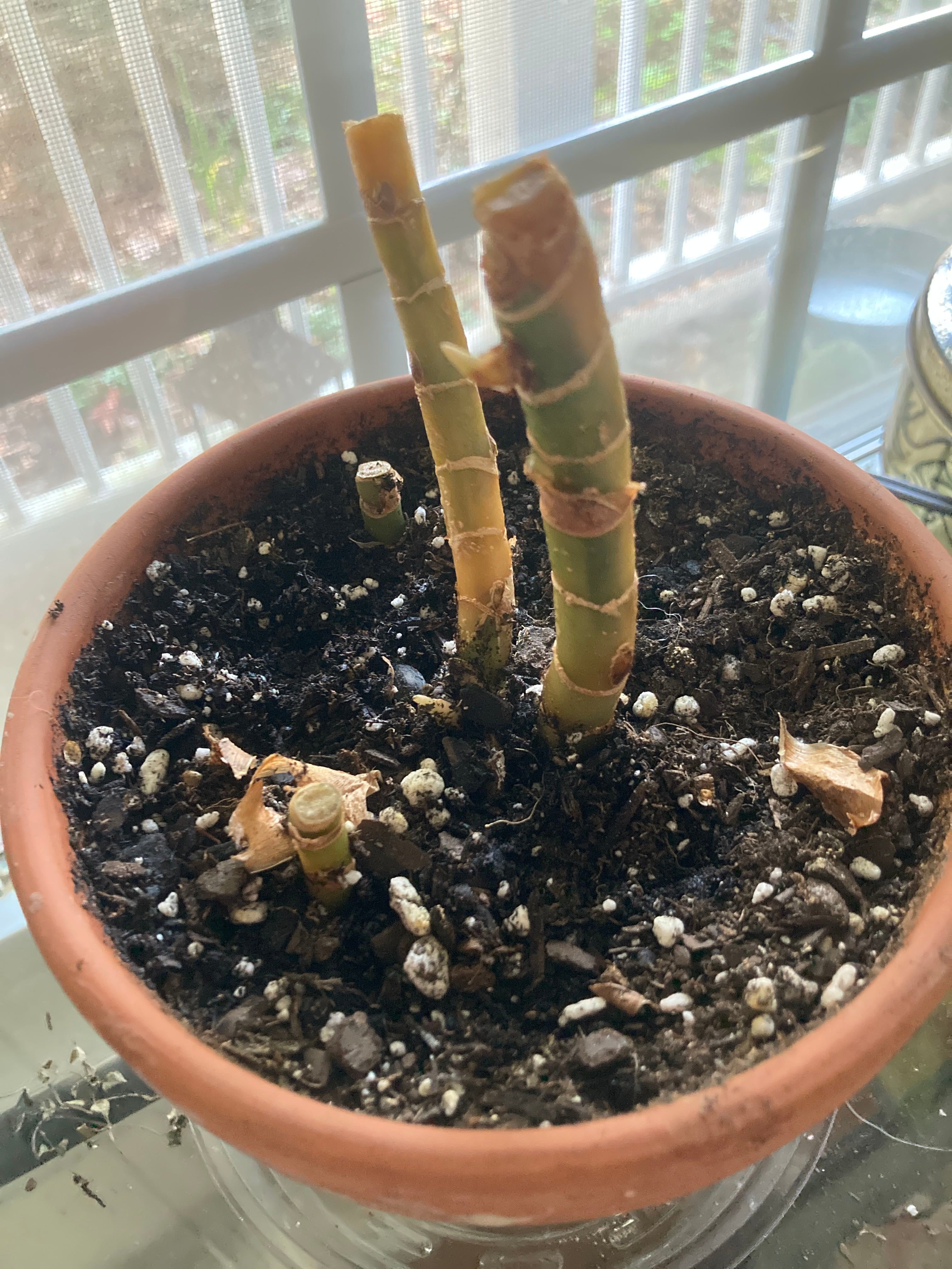 Is this one a goner? #Aglaonema it was getting leggy last winter, so I cut off the tops leaving several leaves below and tried to propagate in water (a no-go.) The original leaves have fallen off, but I kept watering as soil dried and it started several small offshoots, not yet leaf producing. Then the middle of the stem seemed to get woody and dry, so I cut above the dry area and am trying to stick the green tops to (I know not likely) root in the same lot. Is she dying a slow drawn out death? Is there hope? #help #PlantGraveyard #NewGrowth #PlantTherapy @