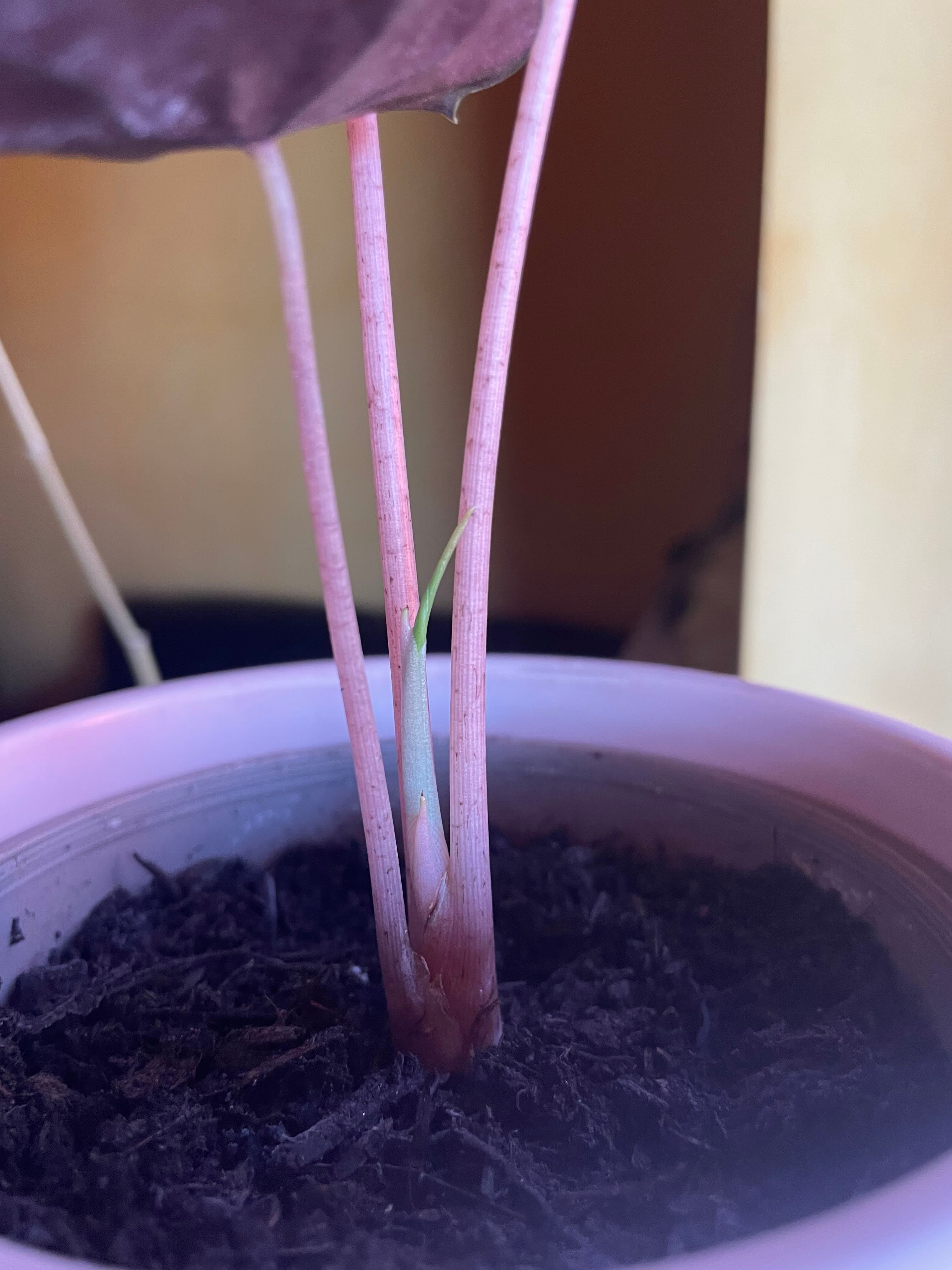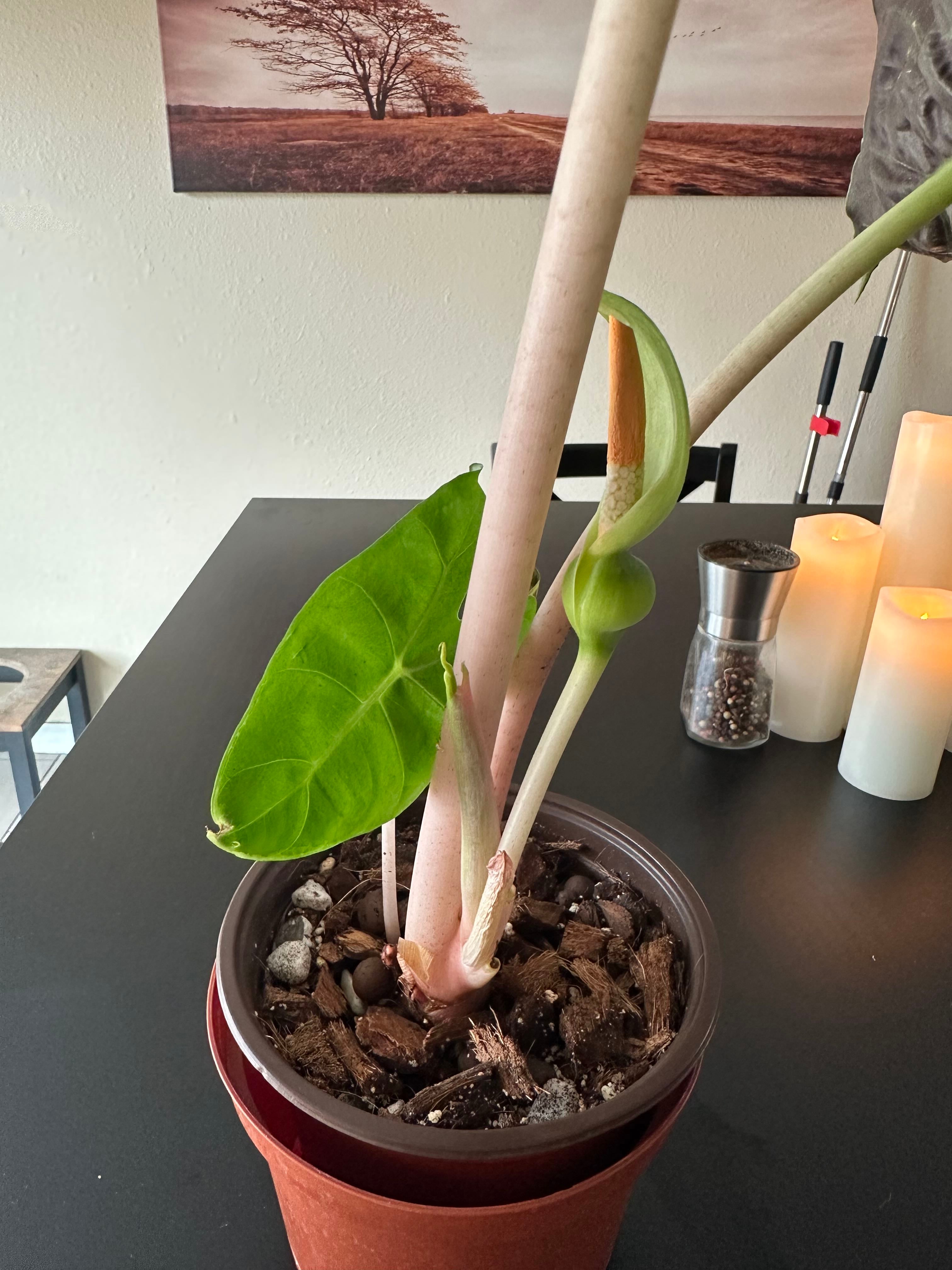 What a pleasant surprise. I noticed my pink dragon popped out a flower. I’ve never seen that before. I thought it was a new leaf coming in. I thought it was too pretty to not share. #HappyPlants #NewGrowth #AlocasiaAddicts #Alocasia