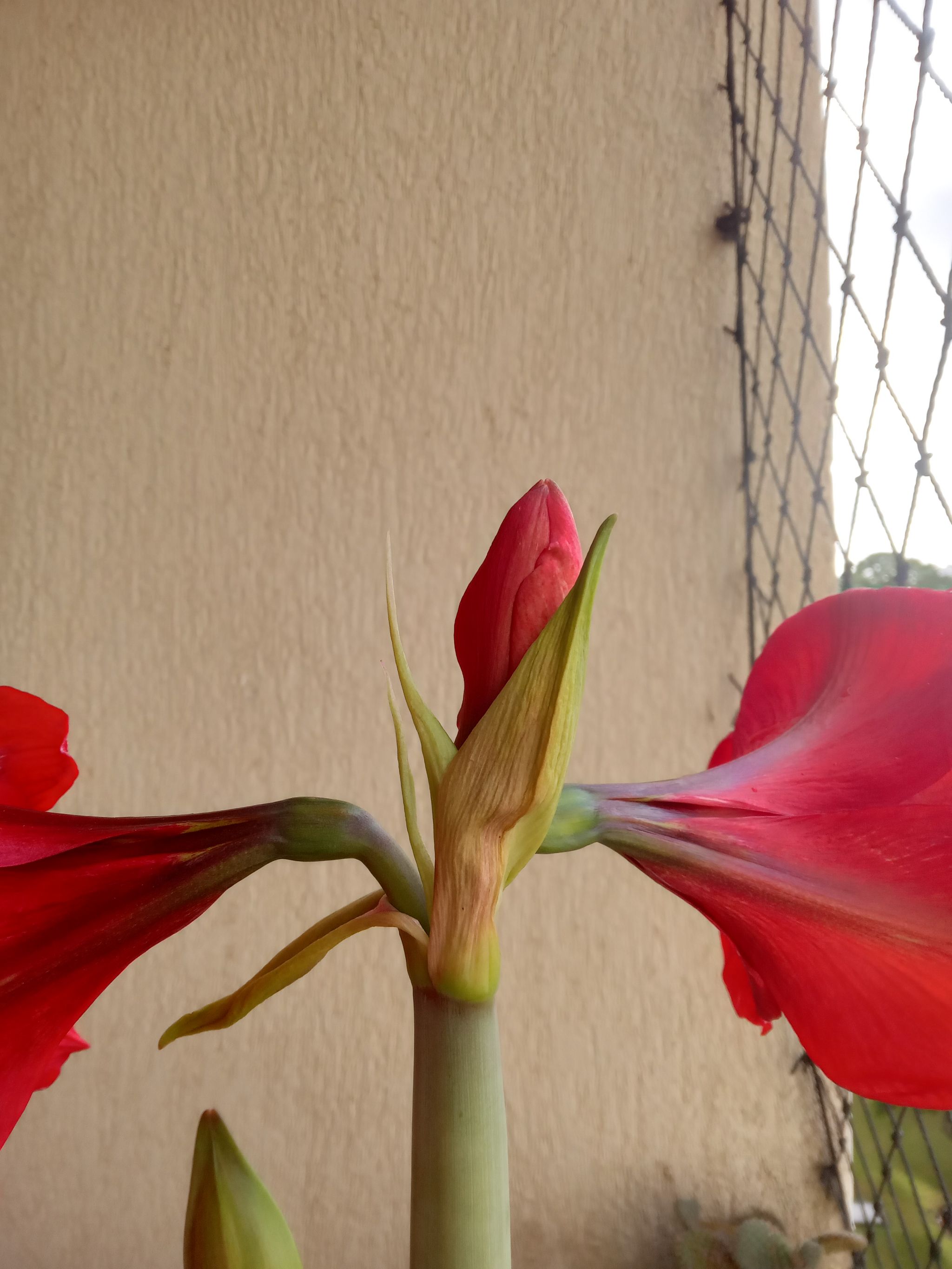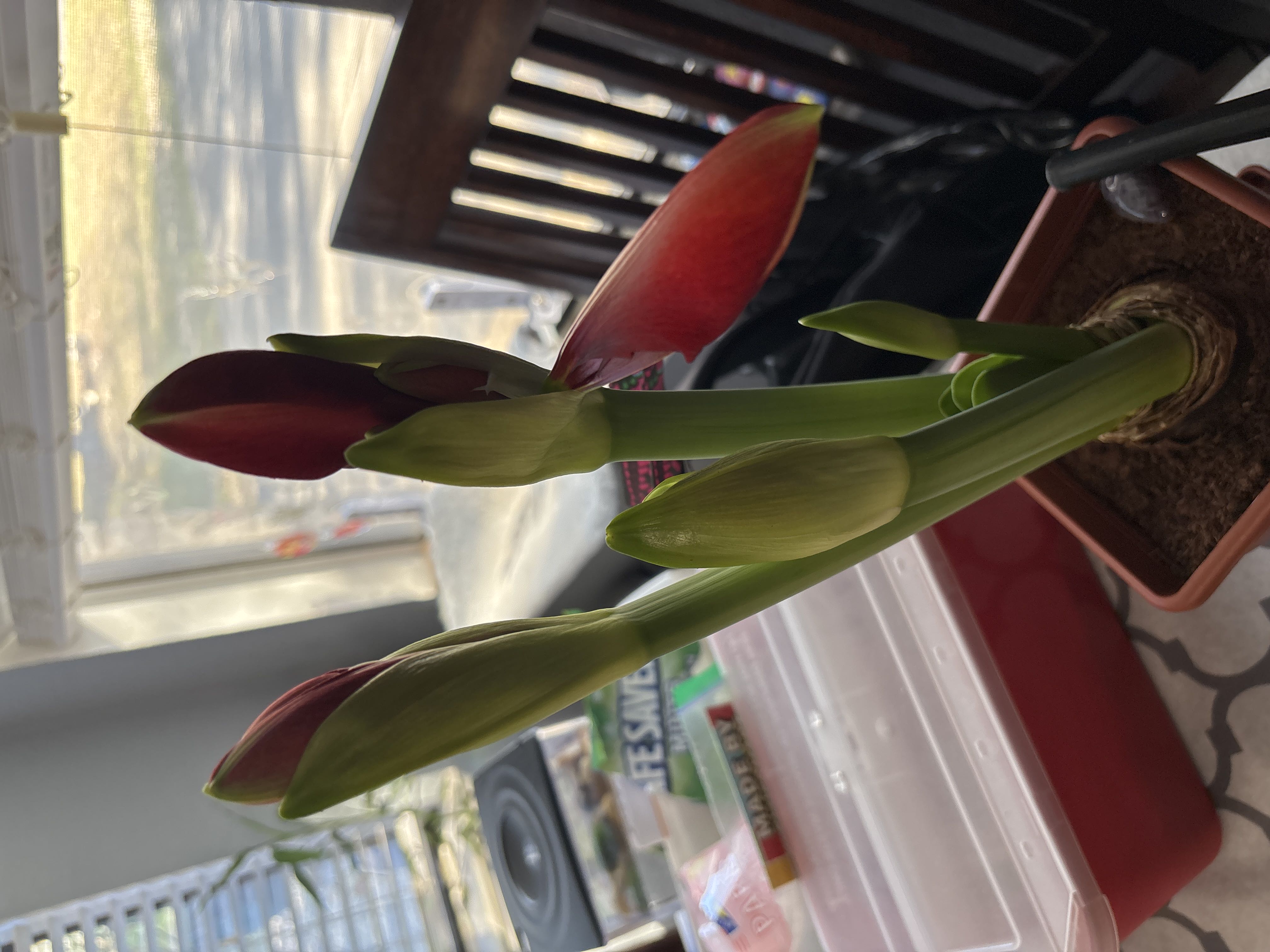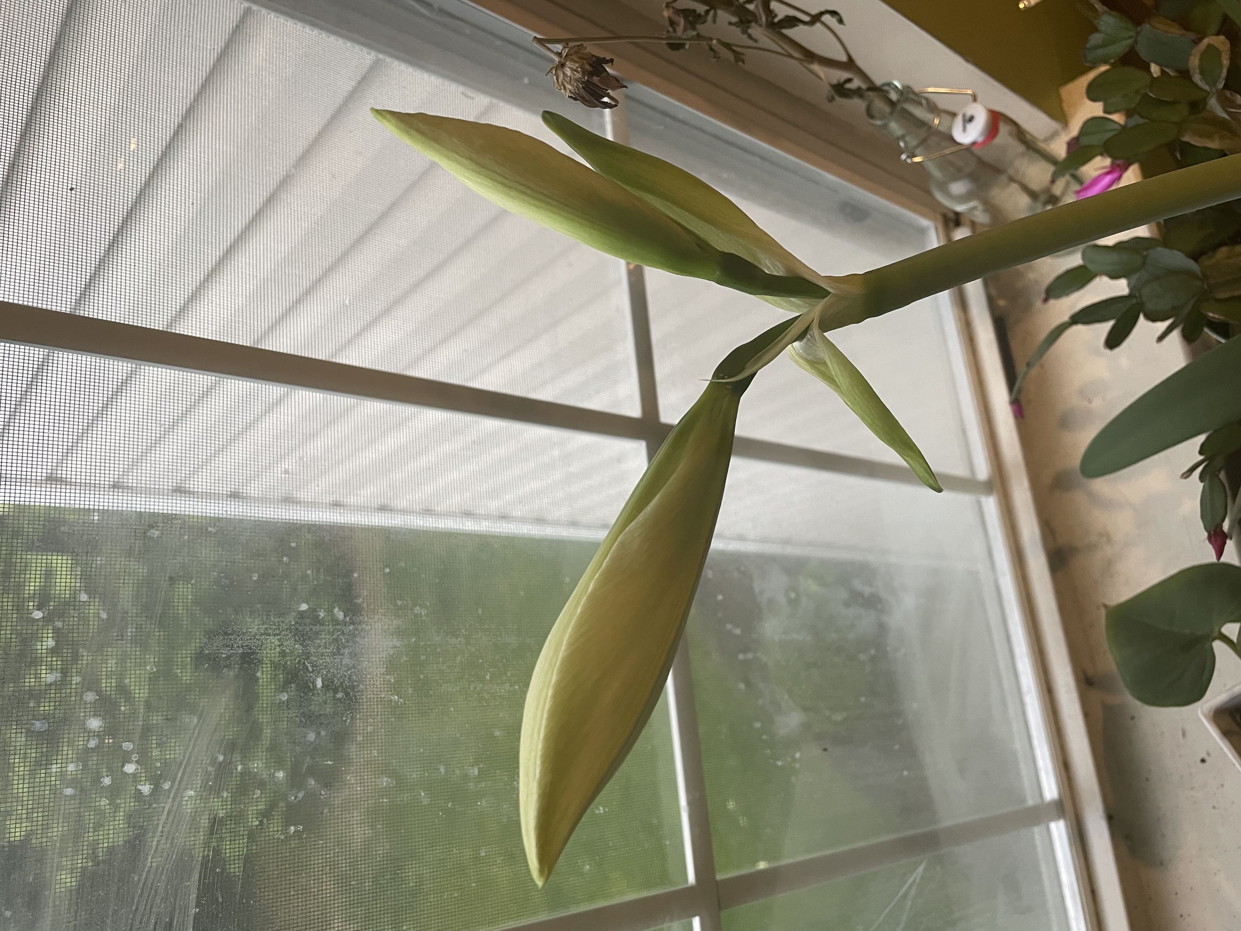 Is this #amaryllis broken? I have had some bulbs before that grew four blooms at a time, but… there are FOUR BLOOMS inside this ONE BUD! And then at least three more budding stems! Is it malfunctioning?!!!