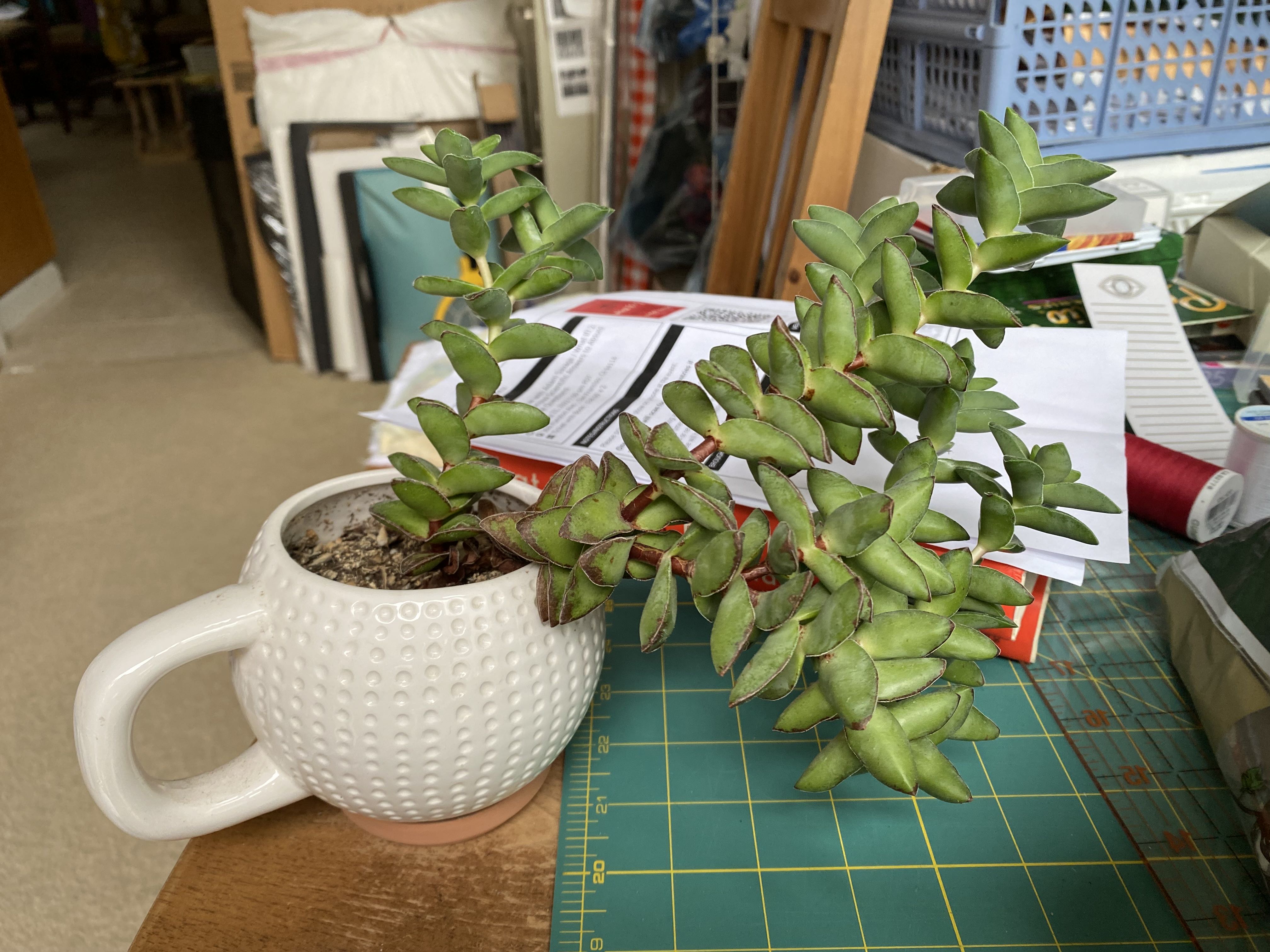Can I repot this plant even though it's October? My springtime crassula has finally grown long enough to tip her pot over. Conventional wisdom says to wait until spring, but I don't want to have her resting on her lower leaves for that long. Would repotting her right now be a bad move? #Crassula #crassulaposting #pottingadvice