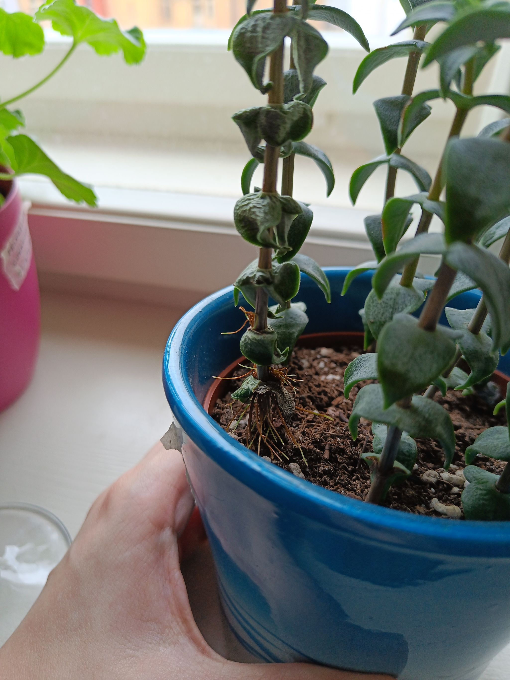 My plant grew these weird roots on one of the stalks. I was underwatering it for a while, when I finally learned to water properly the other stalks recovered but this one didn't. Any ideas what to do with it? #Crassula