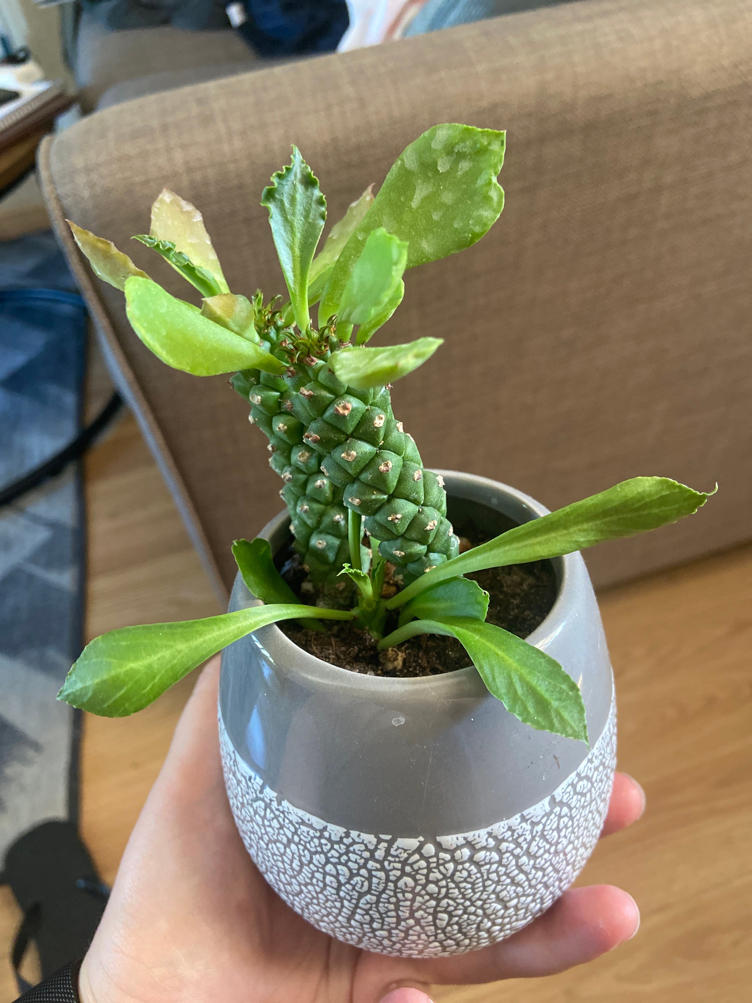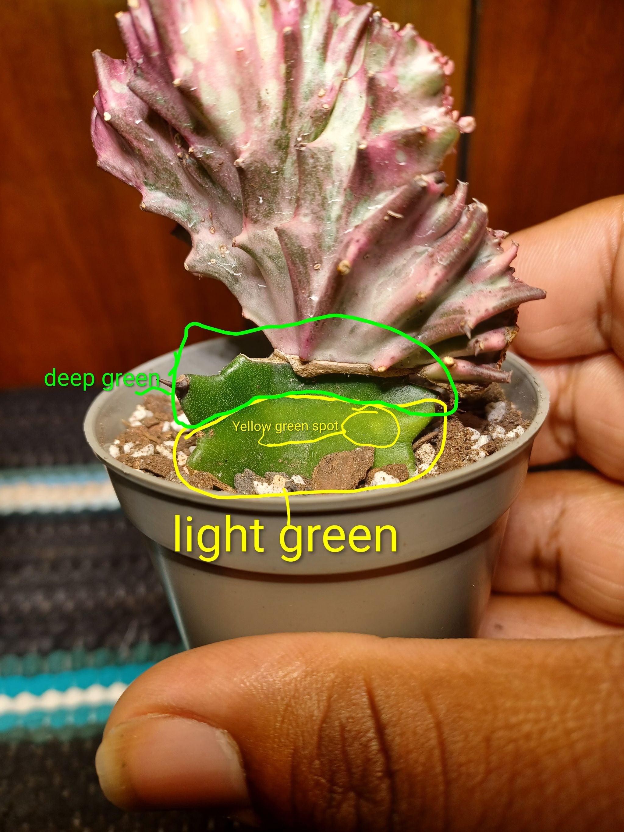 Is this normal? Please tell me i'm right🥺🙏 @SirLiquorice #euphorbia I don't understand why nobody notices this on reddit i mean the lower part of the euphorbia is light green and it is rising up to the deep green on top of the graft and it can be seen on the growlight that's above it. Has anyone see this happened before and please tell me the answer that is it going to be fine or not?😟