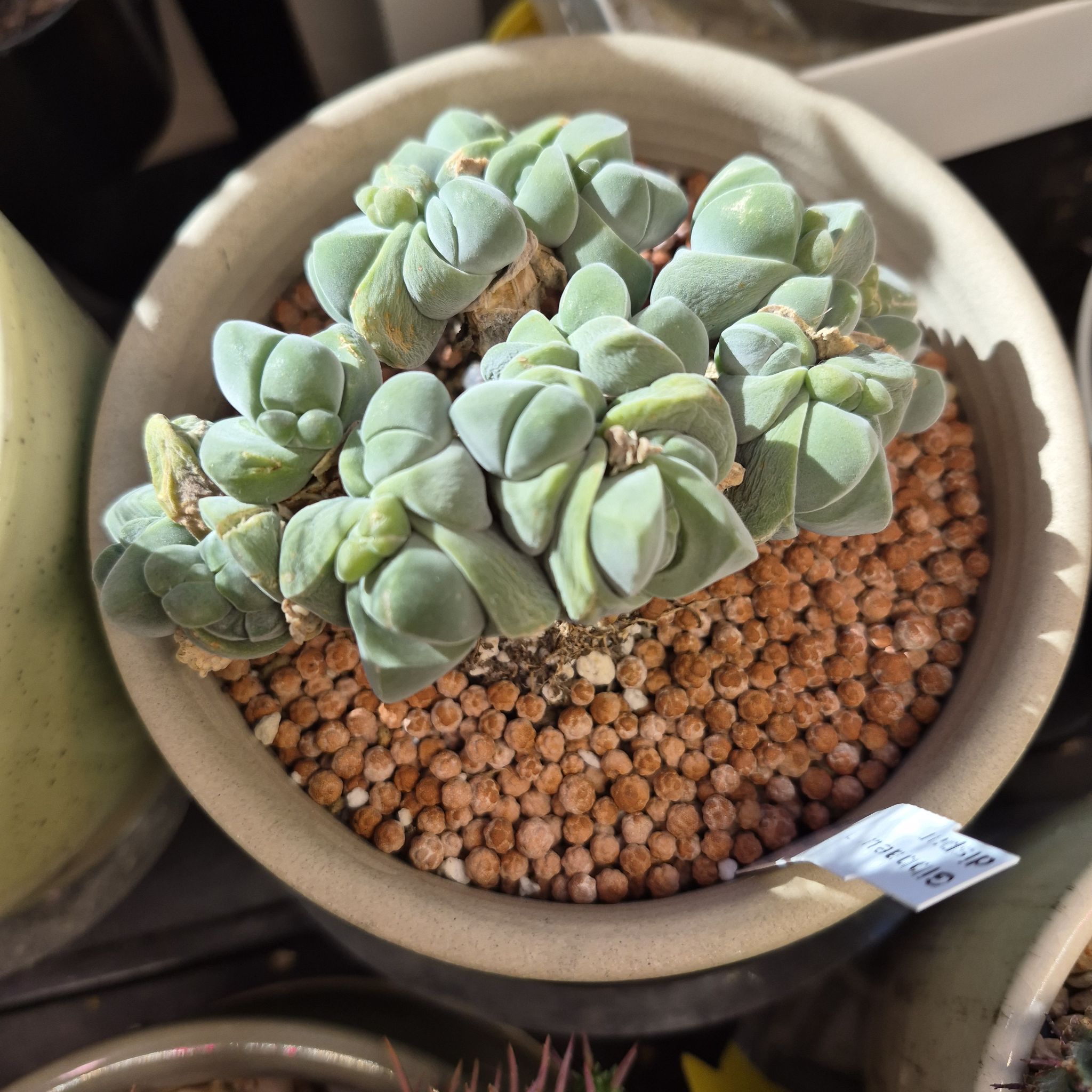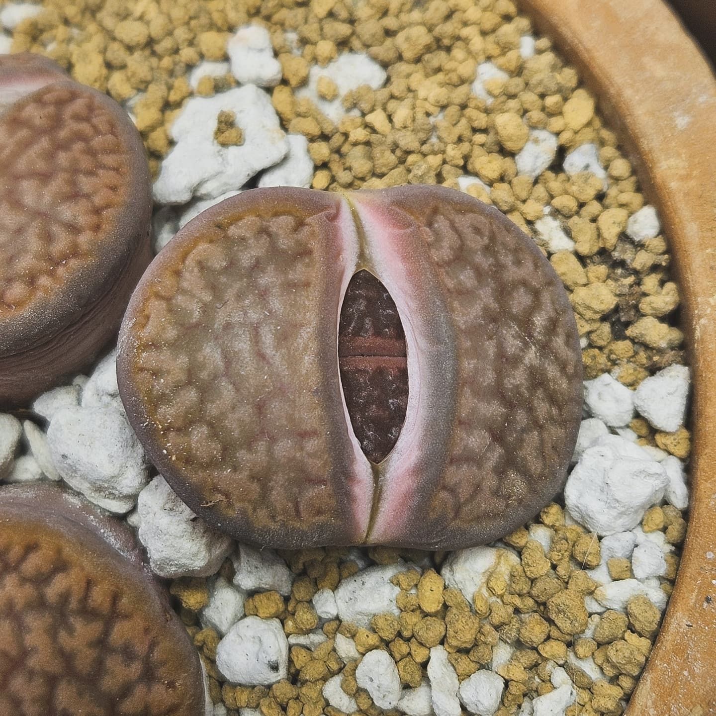 #succulentsquad #succulentsquad This plant had some full seed pods when I got it. I'm good with the extraction (dry, soak, dry, dry), decent with the potting (coir, perlite, vermiculite on top), but the 3-month mark is where I fail at seedlings. Let's see what happens cuz this would be a nice, niche win. Pictured also is my first Gibbaeum dispar. Note how compact it turned - the base is pretty much a mini tree trunk.