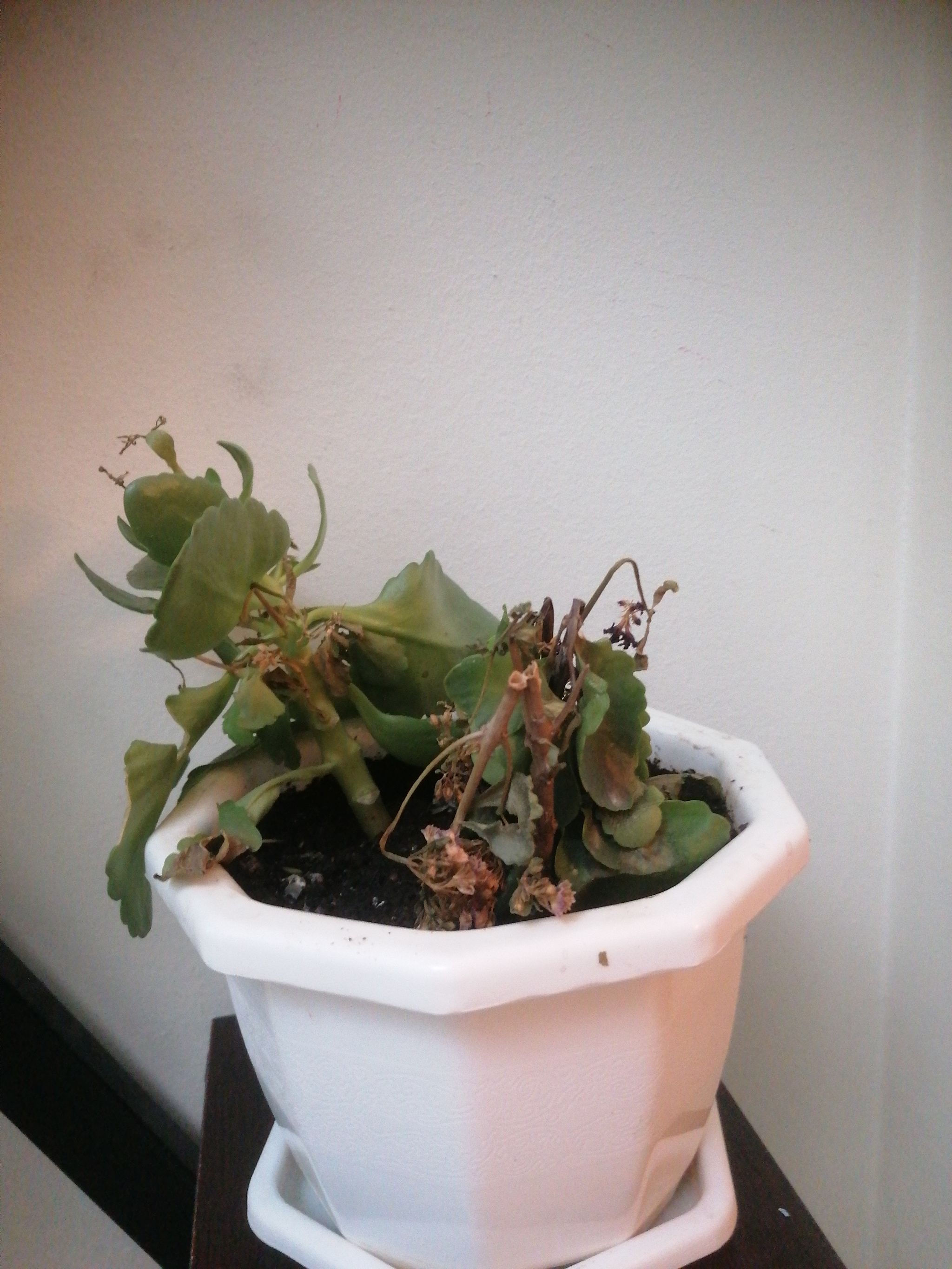 My plant is utterly dead. #Kalanchoe There is no way of reviving it and I have no idea how this happened,I cared for it exactly how I was told to but it started drying up before repotting (which was 2 months ago), I assumed it was root rot so I repotted but nothing has changed. I started being less generous with watering but nothing seemed to be working, she was a blooming, wonderful plant until it all suddenly went down hill. Only 1 of the 3 is still somewhat alive. Is there any way to save this plant?