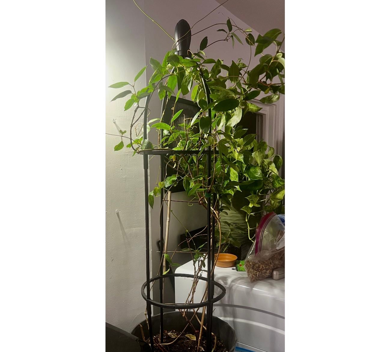 Brazilian jasmine is super leggy—should I chop? I’ve had this #BrazilianJasmine for three years now. It stays outside all summer and comes inside to live under a grow light every winter. The first year, it threw a fit and dropped all its leaves, but since then, it’s happy. I learned to acclimate it slowly. So, over time, it’s vined around two trellises (I put the taller one in when it got too tall for the smaller wooden one, but by then, some vines had hardened into wood around the small trellis, so I left it in. It’s growing ridiculously tall, about 5 feet from the bottom of the pot to the top of the vines, and the bottom half of the plant has very few leaves. Should I try to chop and prop it? I’d also like to repot it, because I’m sure by now it’s getting root bound. It’s been in the same pot for three years (I replace the soil on top every spring because I didn’t want to deal with repotting with the trellises, but I’m willing to wrestle with it now, lol). I’m inclined to wait until spring no matter what, since it’s really happy right now and growing tons of new vines and leaves, I don’t want to disturb it. Anyway, I’m curious what other owners of plants like this do when it gets very bare on the bottom. Thanks for your thoughts! 🤗🩷🪴 #HappyPlants #PlantsMakePeopleHappy #NewGrowth #PropagationStation #PlantTherapy #ToChopOrNotToChop #babevila #FloweringPlants #GregGang #Greggers