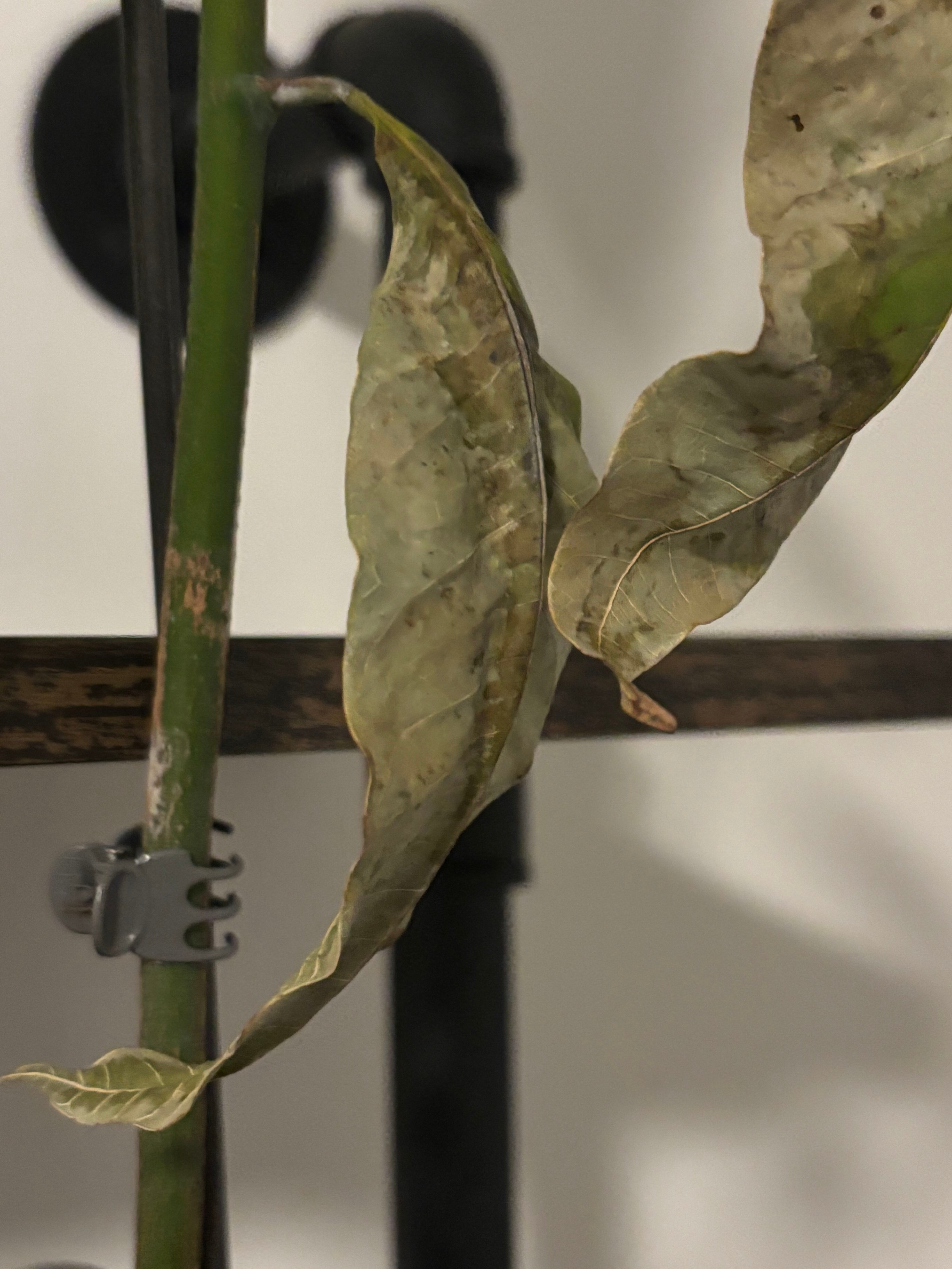 Mango leaf troubles Hello! I’ve been growing a mango from a seed since this summer, very proud of it. Unfortunately, I’ve been noticing its leaves have been drying out a bit, and I was wondering if anyone might have some ideas what might be going wrong with it. It typically lives outside (Florida) but this cold wave has pushed it onto the shelf out of reach of the cat. Any help would be appreciated, have a great day!