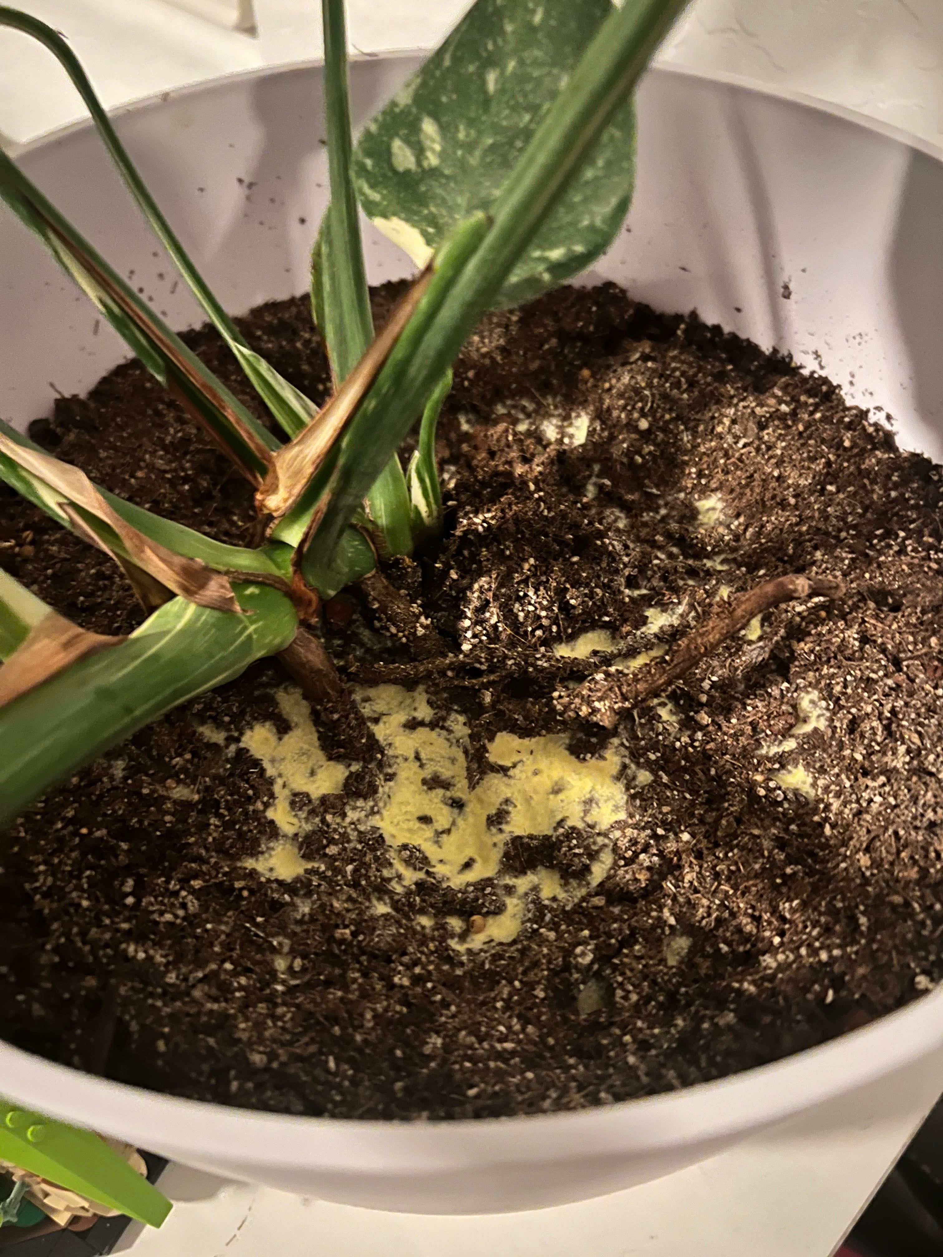Yellow growth on soil surface #Monstera having a little difficulty with this Thai con, and getting yellow growth (mold?) on the soil surface, large pot potentially a bit too large and within a foot of a window with a good screen to prevent leaf burn. Watered only when Greg reminds and humidity probed before to confirm dryness. Any thoughts on what the growth is? And from there best treatment and how to not get it in the future?