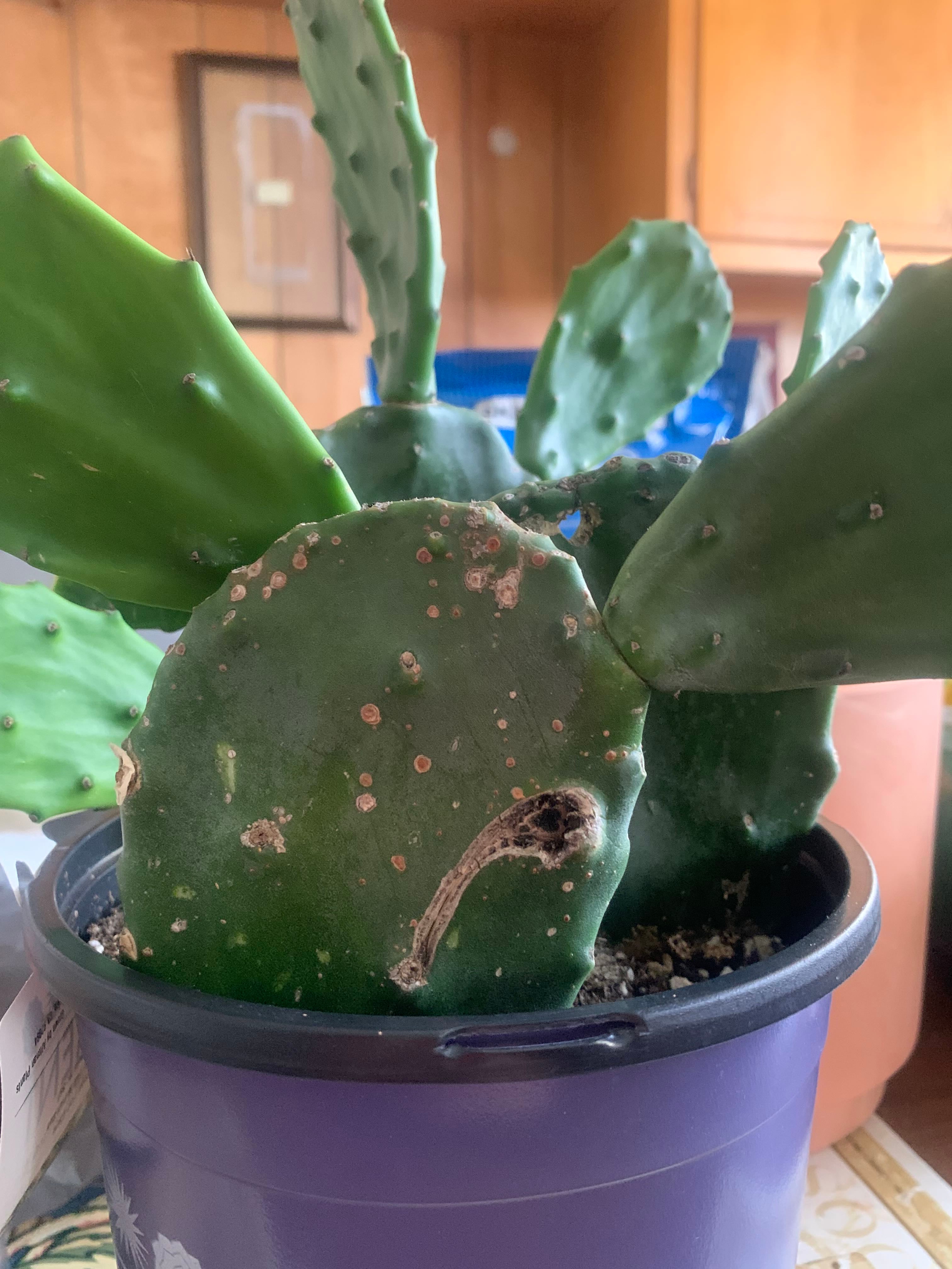 What’s up with my prickly pear? Bought her from Walmart, who im sure doesn’t care for their plants well, and wanna know what all this is, if I should do anything about it, and if so, then what? Additionally, the pot has this succulent inside that I’d like to repot but I’m unsure how to safely do so seeing how it seems to be hanging on by its roots a little. Any and all help is appreciated <3
