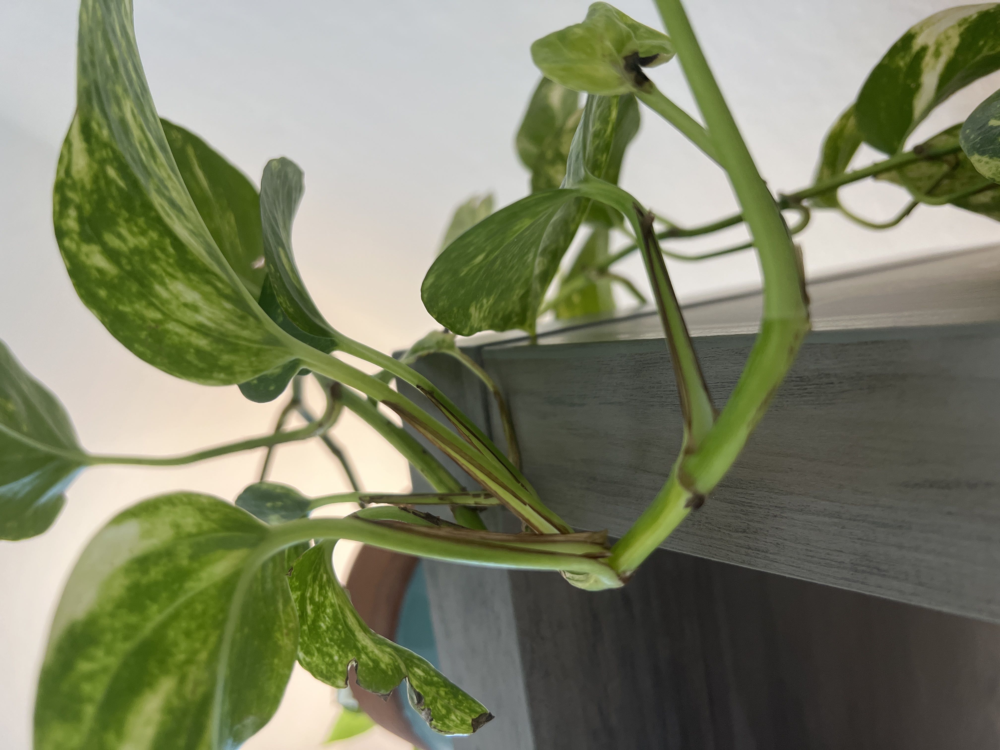 My pothos is crispy and holey! I can’t figure it out, for the life of me I cannot spot any pests but look! The only thing I can think of is my 34% AZ humidity even with a humidifier?? Thoughts?? I’ve treated with neem and an insecticidal soap for the past month. Never once have spotted a pest though. Even my new leaf came out with issues (second photo).