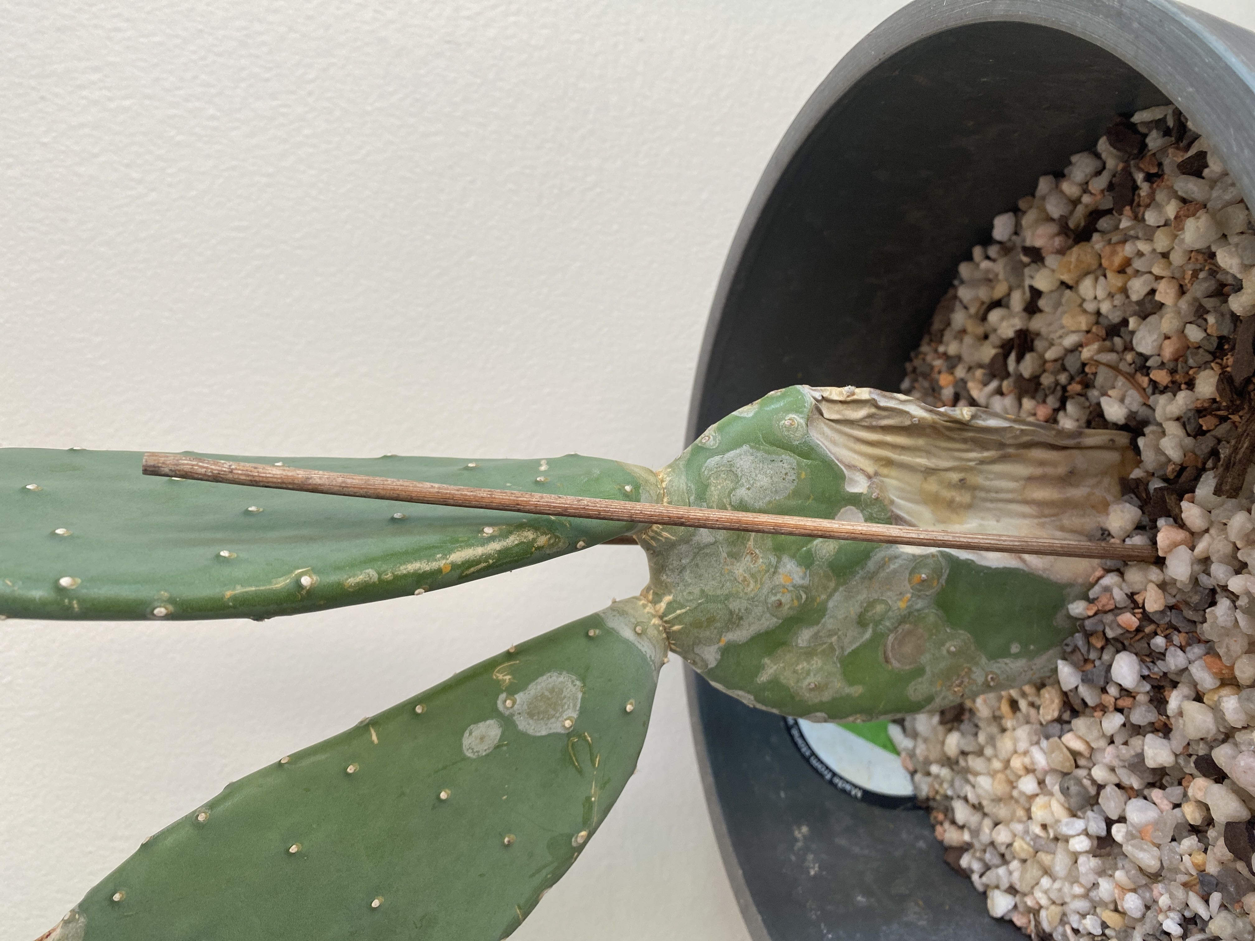 Hey #CactusClique and #Cactus loving Greggers, I have a problem. Why is my cactus so floppy? 😅 This guy is a #PricklyPearCactus, and he’s been growing this new pad for a couple months after flowering. The original pad was placed into the cactus soil unrooted with another prickly pear species, and two other pricklies have been added since then. His two lower pads have always been a little wrinkly, but over time they’ve been able to stand on their own without stakes… until now. I water when the soil is dry, I keep them under a plant light. And I try to support the floppy pad when it’s too slumped over. Any suggestions out there as to how I can help this guy?