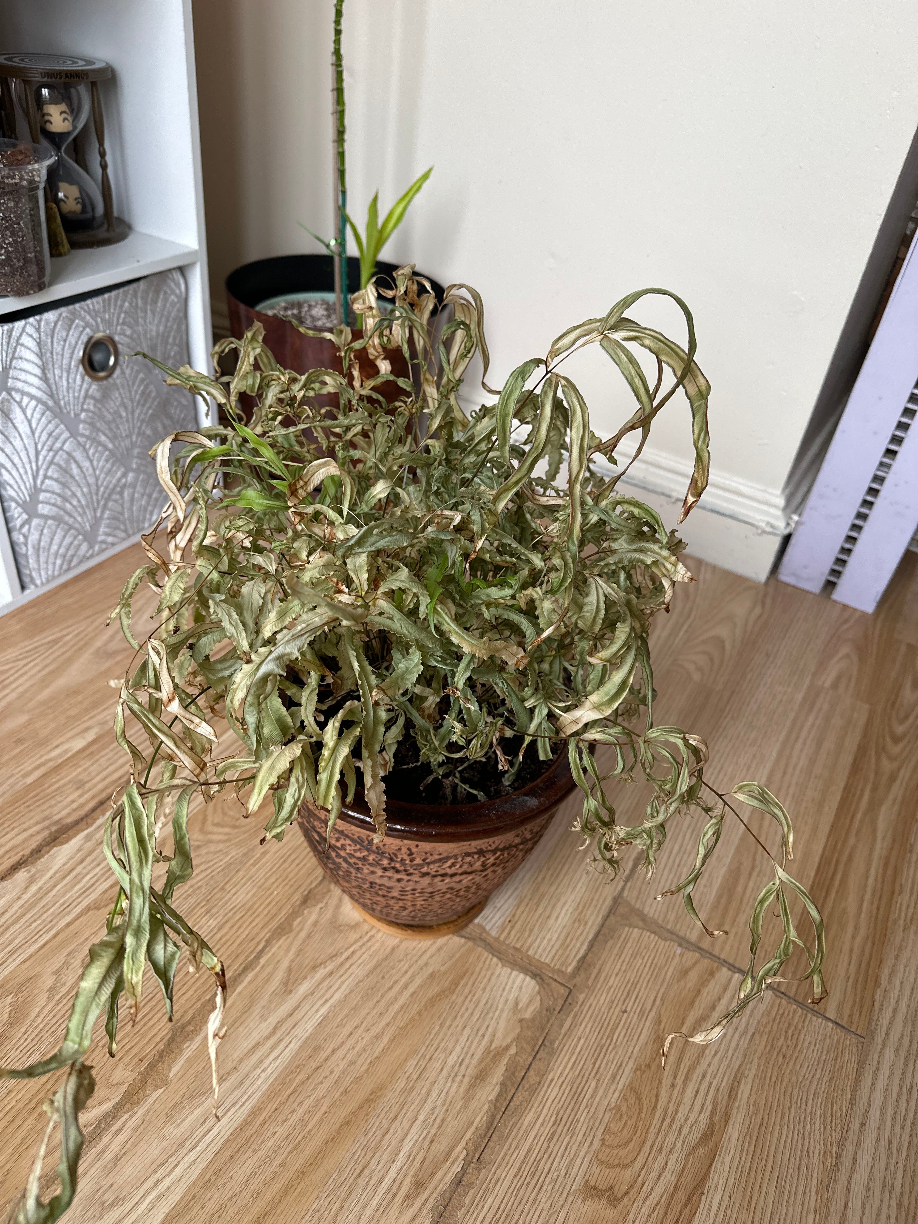 Need help with my fern. She’s looking limp the past few days and the new growth is either wilting or crisping before it can get fully grown. It seems all new growth is now dying or already dead so I don’t know what is wrong with her #BrakeFern #help