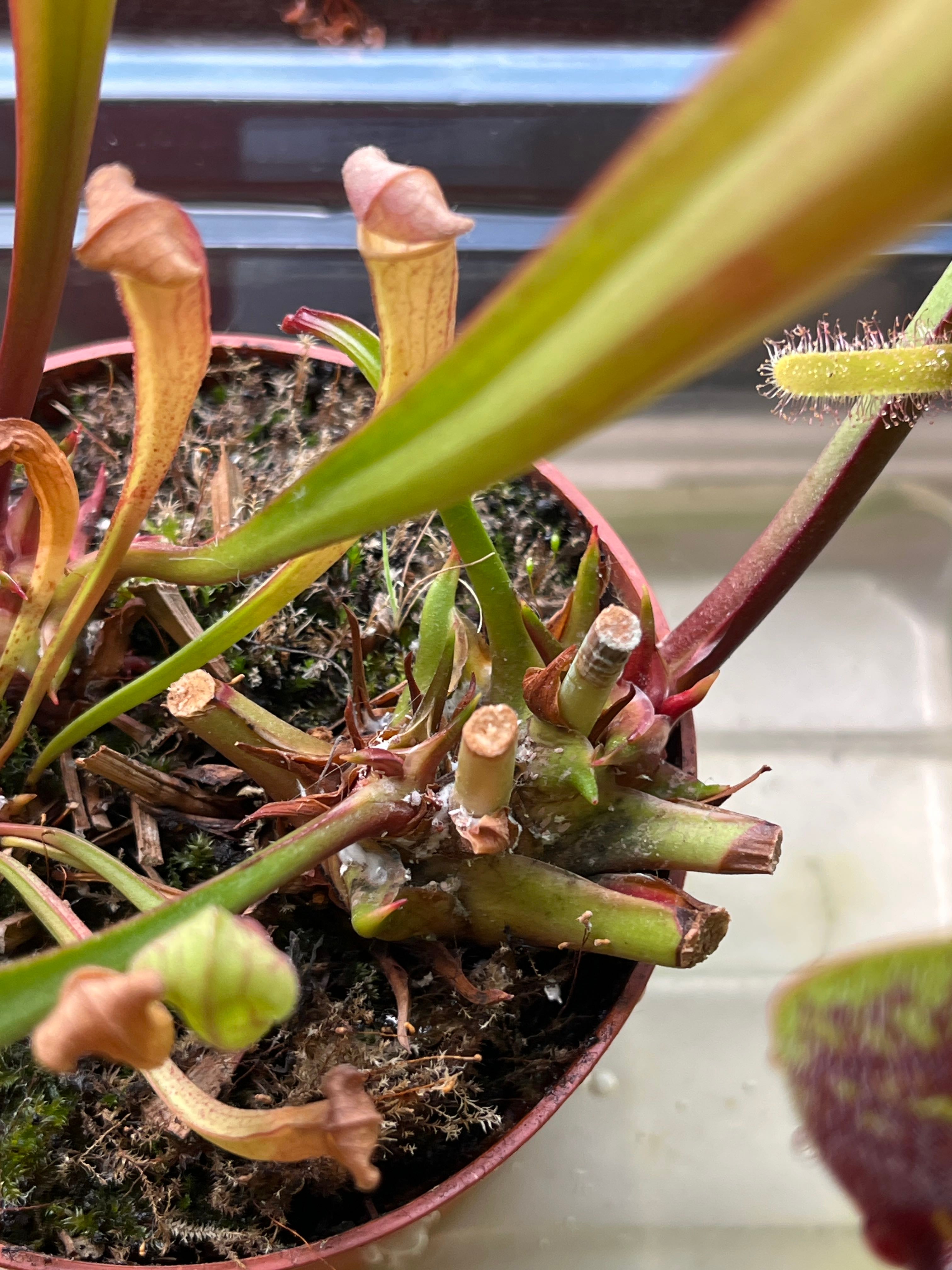 Rotting pitchers in Sarracenia maroon? Hi everyone! I purchased an S. maroon from a garden centre last Wednesday, it wasnāt in the greatest condition but there was new growth coming and it was the healthiest of what was available. I gave it the same treatment as the rest of my sarracenia (left in a tray of distilled water) but also quarantined it in the bathroom incase it was diseased. A week later and the new growth has rotted from the base up. Whilst the rest of the pitchers has gone brown and crispy at the garden centre, the new growth had gone soft and dark brown at the base. Is this rot and is this salvageable? Iāve never had this happen to a carnivore before. (Attached image is today, I forgot to take a picture before removing the rotted pitchers. The thumbnail for the tagged plant is from the day I bought it). #Sarracenia #RootRot #CarnivorousPlants #CarnivorousClub