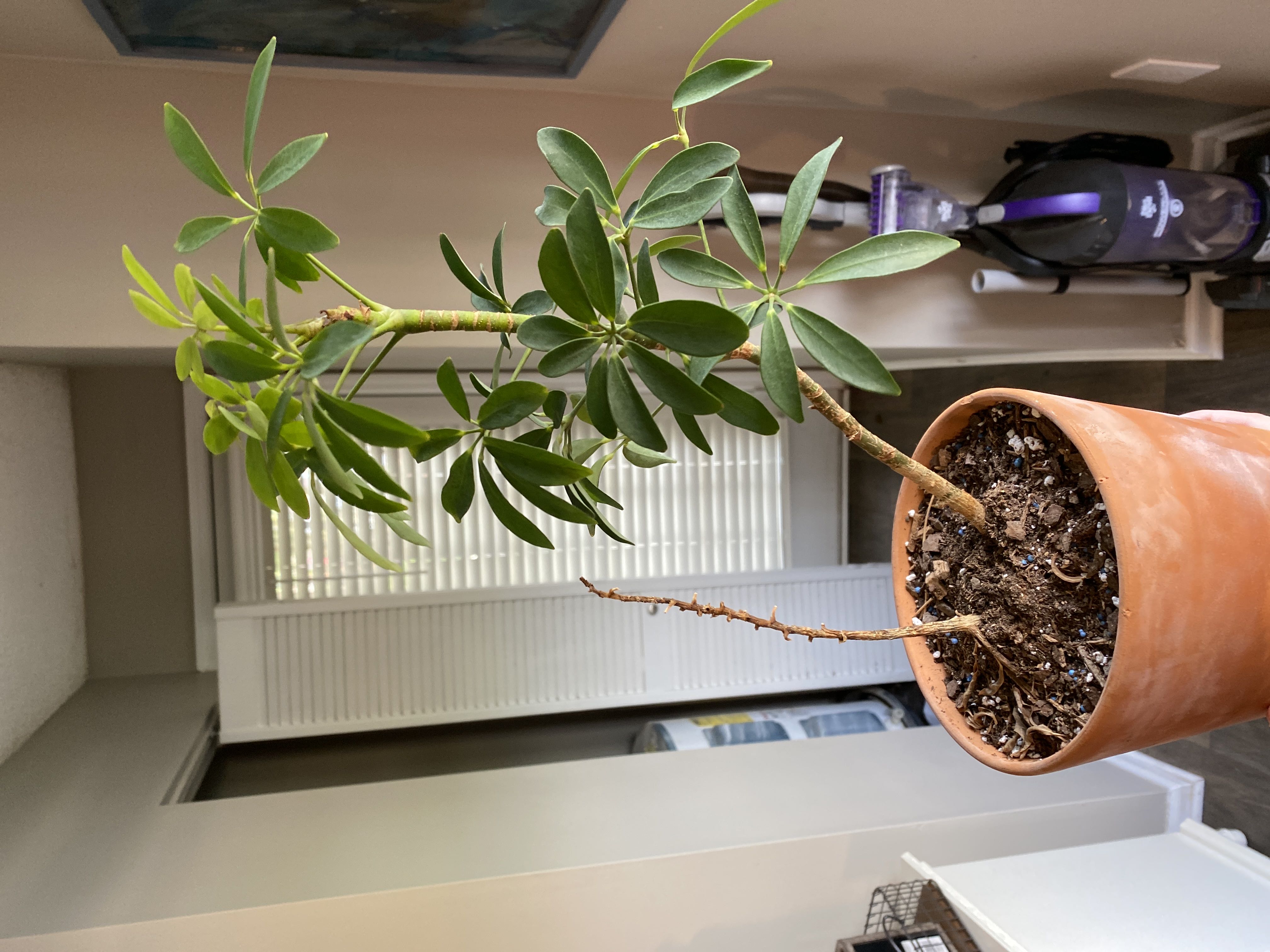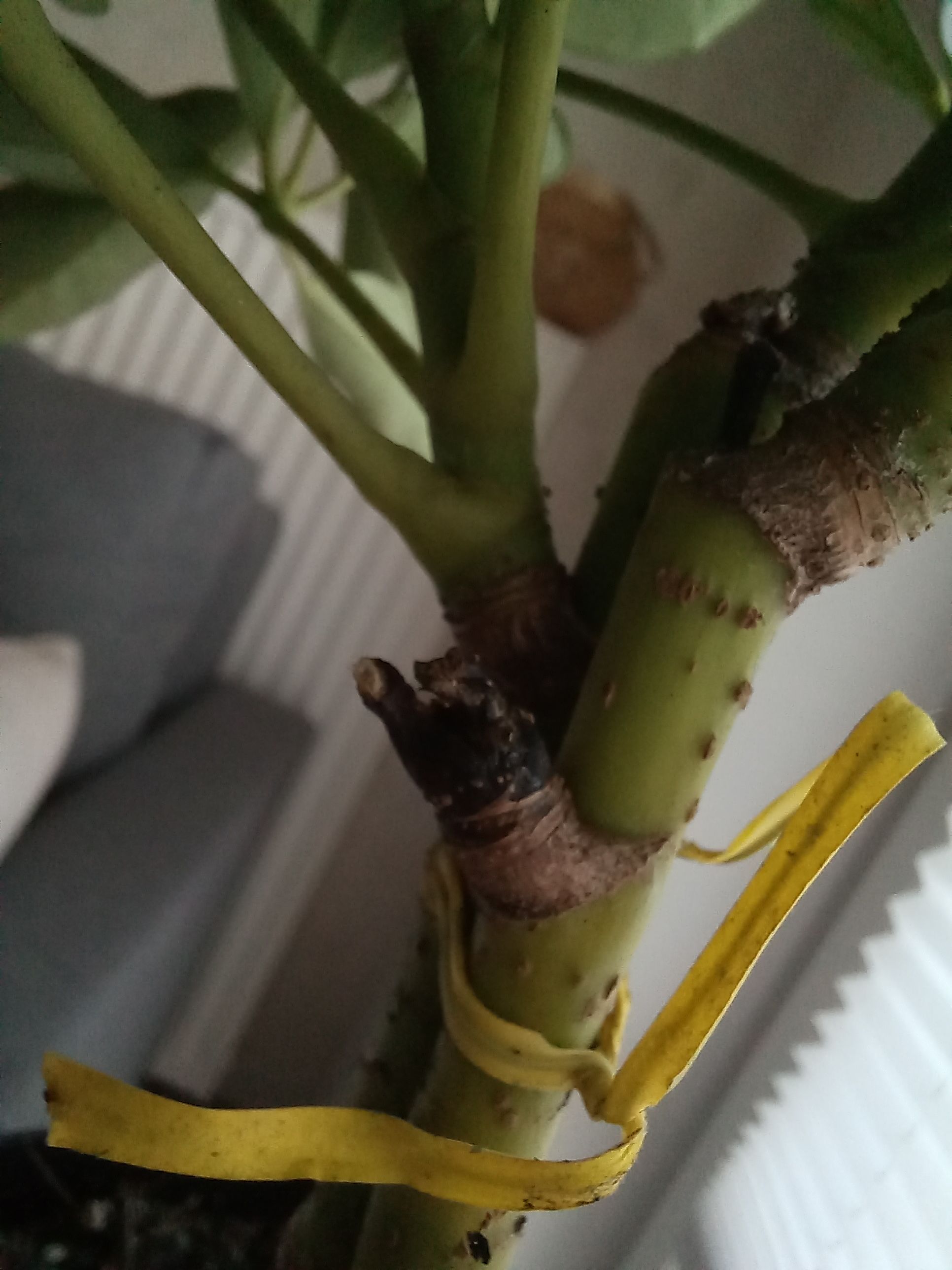 On one of the stalks of my dwarf umbrella, all the leaves shriveled up and fell off. Will they grow back or do I need to get rid of that stalk? The other stalk seems to be doing well. #Schefflera