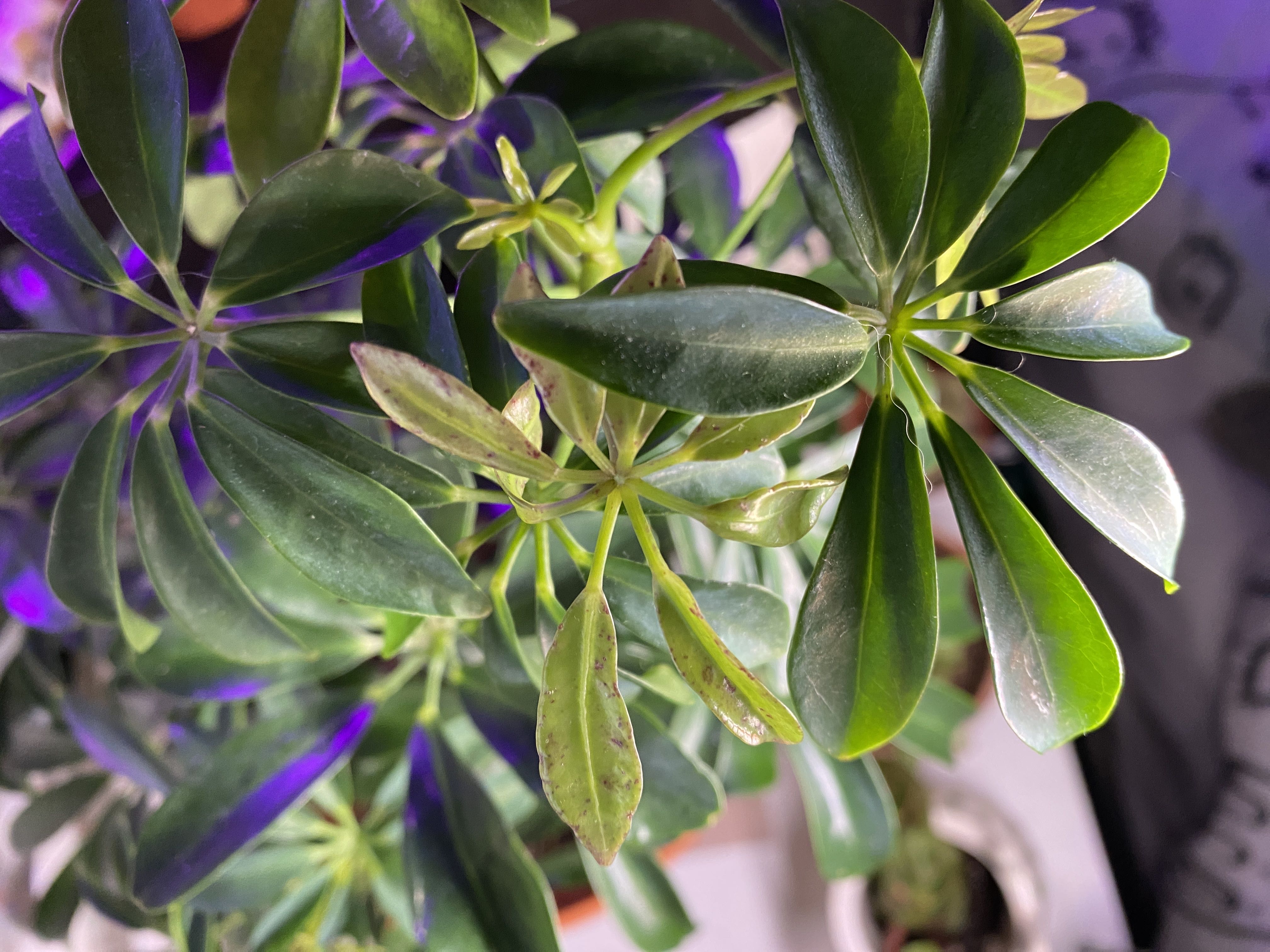 Help with Dwarf Umbrella Y’all, besides the weird aphids happening to my plant, what is happening to her? She also has weird colors on her baby leaves. #Schefflera #DwarfUmbrellaTree #PlantsMakePeopleHappy