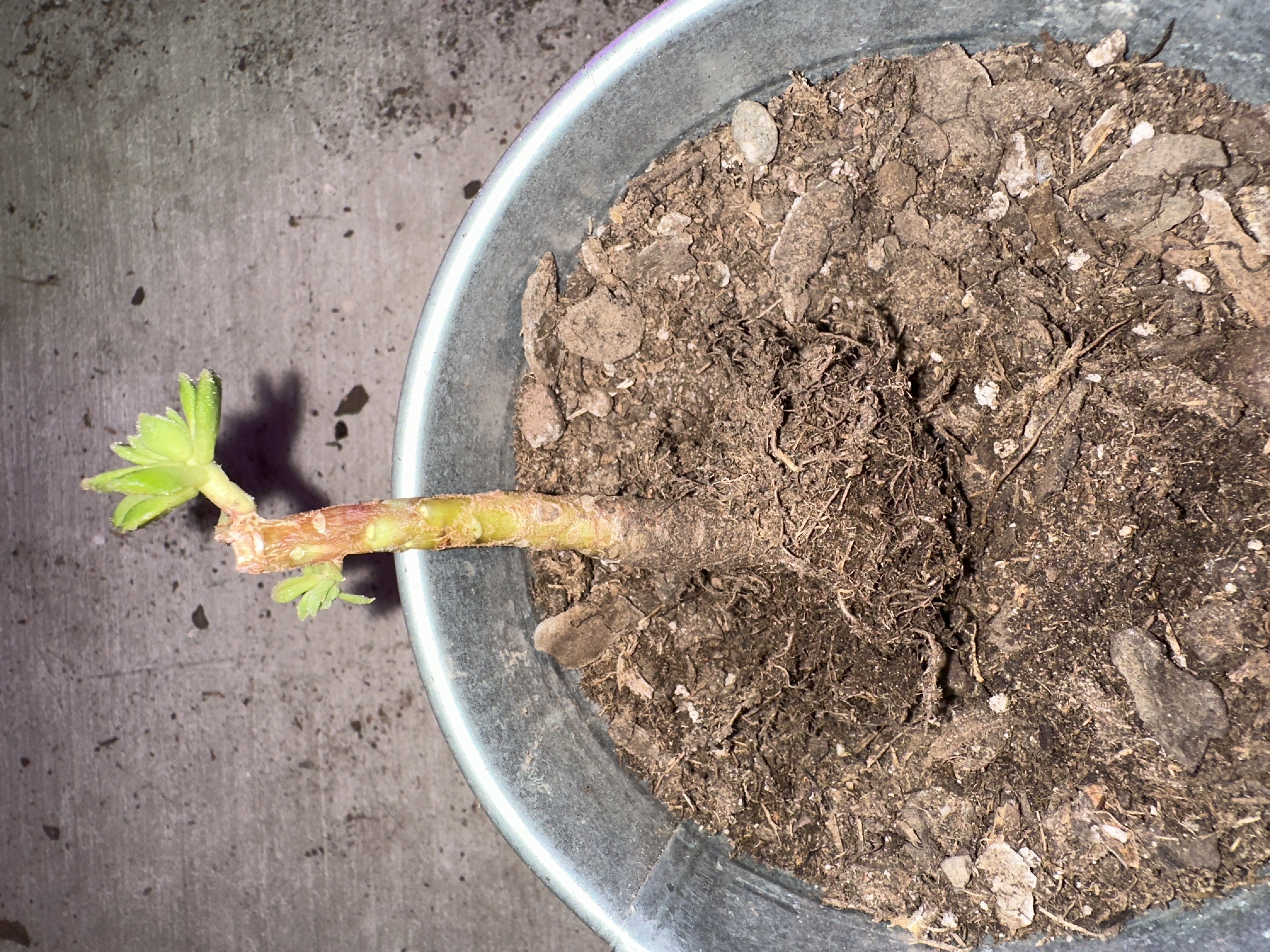 Now what??? The other day, my #Sedeveria dropped almost all her mature leaves. I thought it was likely temperature shock and/or overwatering. So I left it be in a warm spot in my garage under a grow light. (Thatās where it had been happiest prior to dropping her leaves.) Since then it has dropped the rest of her mature leaves and the stem looks like itās starting to get prune-y. I pulled her up to check for root rot but see nothing. How do I save whatās left? Just let her dry out, repot, and pray? Whatās else is there to do? š #help #leafloss #SucculentSquad