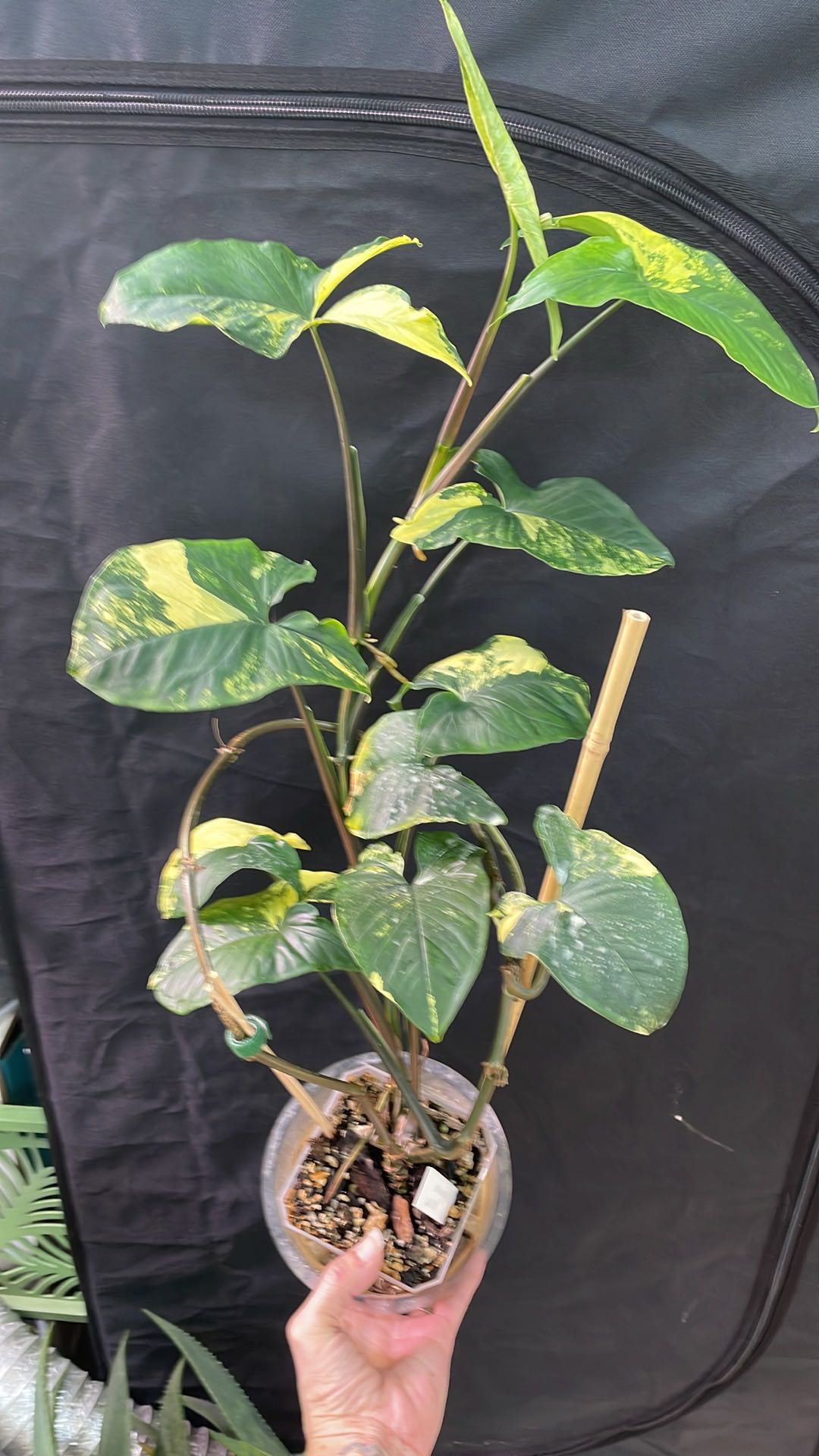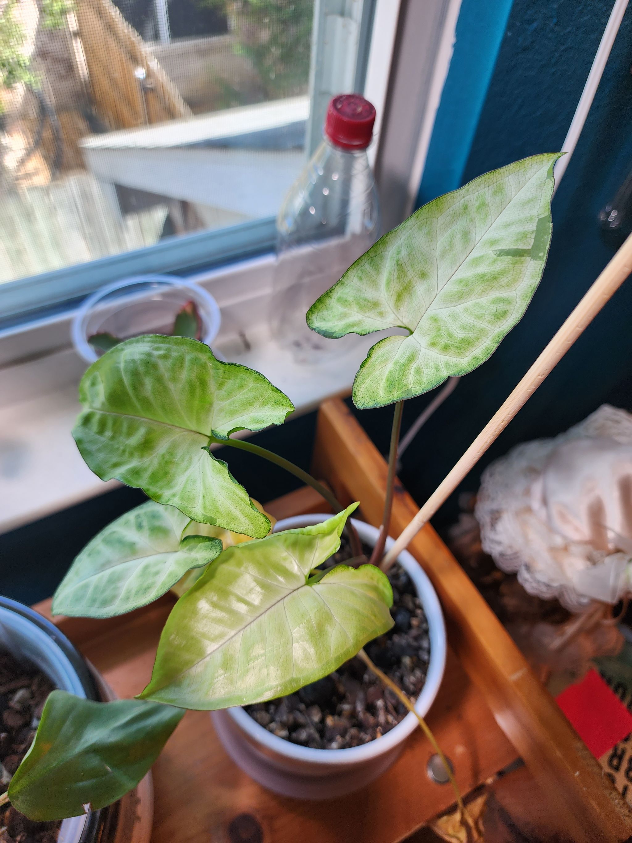 Here’s an update on my Syngonium milk confetti! I added a trellis for some support. I also put a small humidifier next to them. I hope this helps it to stop flopping over. #HappyPlants #PlantsMakePeopleHappy #PlantAddict #PlantTherapy #GrowLights #PlantCorner #PlantShelfie #BeforeAndAfter #PlantLove #TropicalPlants #ThanksForPhotosynthesis #Variegated #Syngonium #SyngoniumMilkConfetti #Trellis
