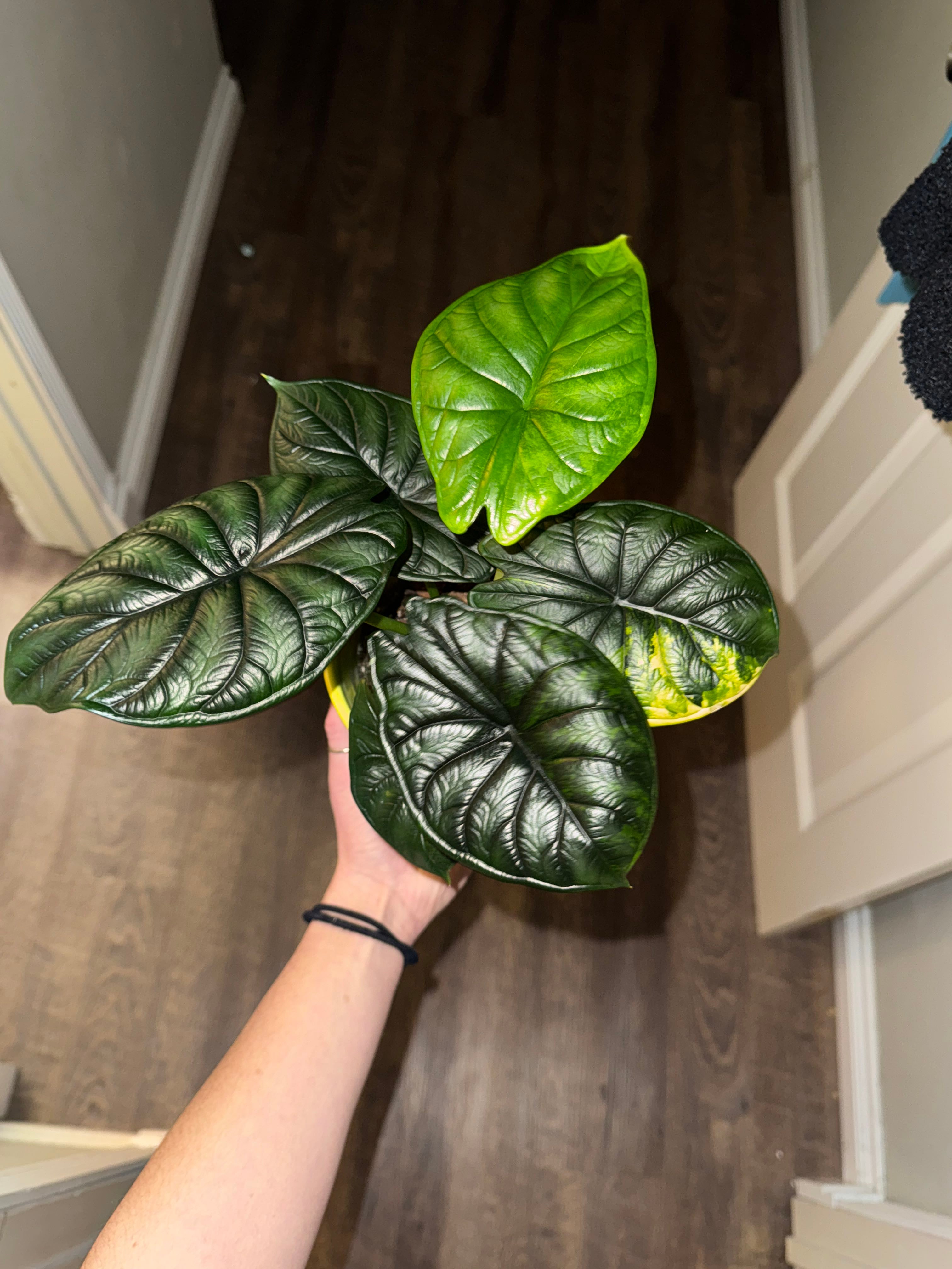 My variegated Aurea Dragon Scale decided to bless me with an Albo and Aurea leaf! Ahhh! Take my picture with it!!!! (Brooklyn 99 Andy Samberg Vc) #HappyPlants #PlantsMakePeopleHappy #variegatedplants #AlocasiaAddicts #Alocasia #AlocasiaDragonScale